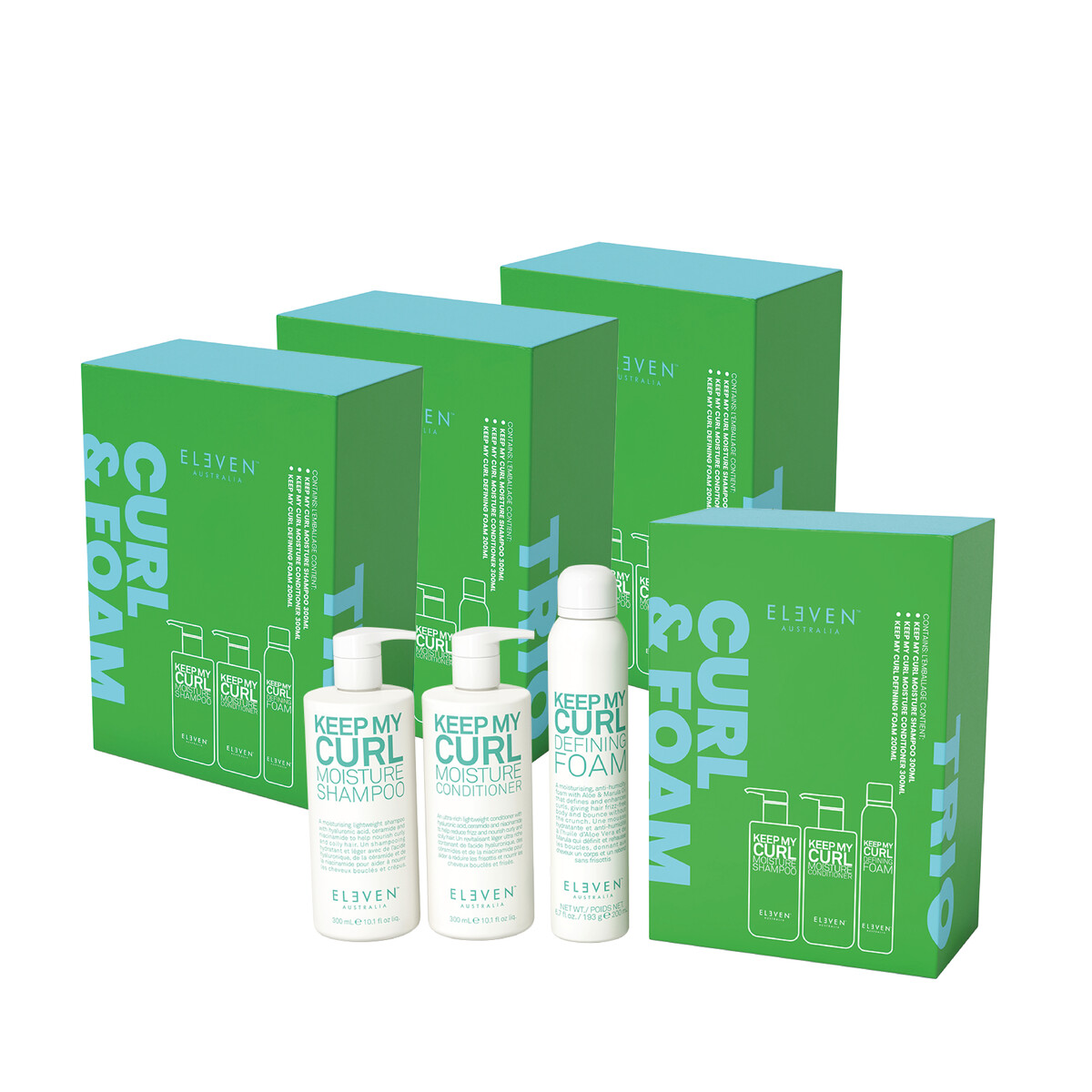 KEEP MY CURL -paketti sisältää kosteuttavan shampoon, hoitoaineen ja uuden Defining Foam -muotovaahdon.
