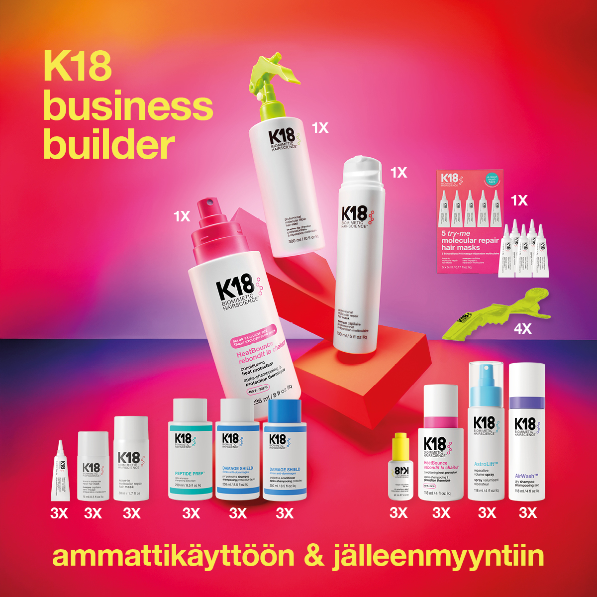 Super Deal! Sisältää kaiken mitä tarvitset tuottoisan K18-liiketoiminnan aloittamiseen kampaamossasi! Tuotteet ammattikäyttöön sekä jälleenmyyntiin! SÄÄSTÄ 18%.