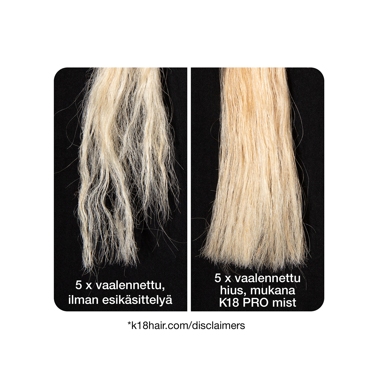 käsittelyyn. Suihkeen on kliinisesti todistettu korjaavan hiusten vauriot 4 minuutin vaikutusajalla. Jo yhdellä K18Hair Mist -suihkeella tehdyllä esikäsittelyhoitokerralla hiukset saadaan palautettua vahvoiksi ja elinvoimaisiksi ennen mitä tahansa kemiallista käsittelyä. Tämän ansiosta hiuksiin syntyy vähemmän kemiallisen käsittelyn aiheuttamia vaurioita.
