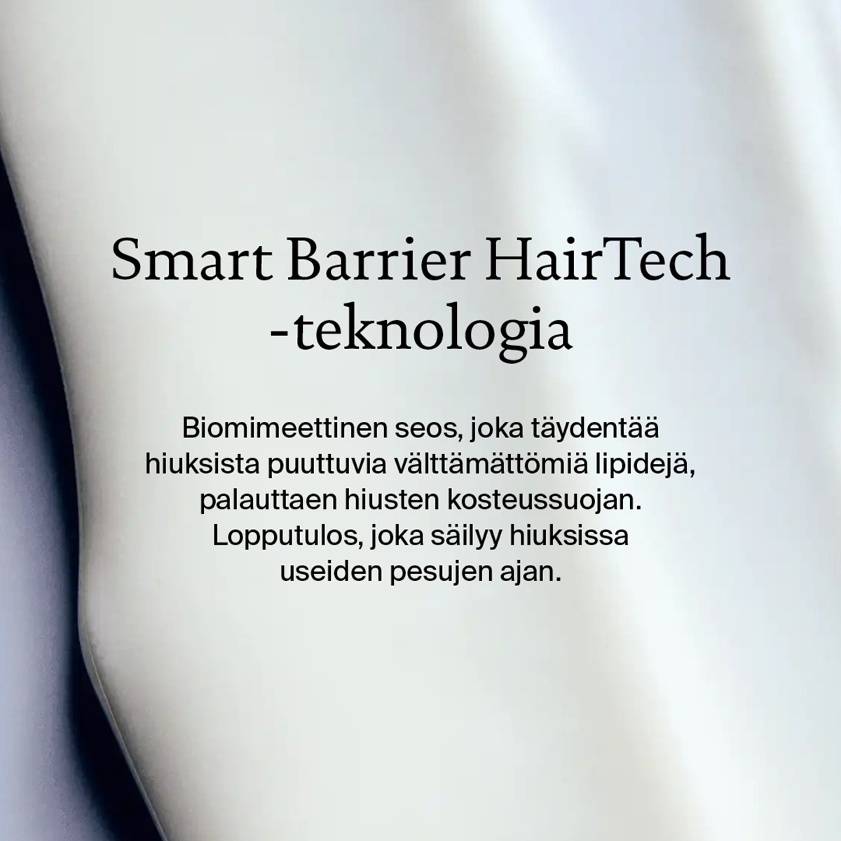 Sisältää Smart Barrier HairTech™ -teknologian: biomimeettisiä lipidejä, jotka jäljittelevät hiuksen omia lipidejä, vahvistavat rakennetta ja tiivistävät hiuksen pintaa. Näin kosteus pysyy hiuksessa paremmin, ja pehmeys sekä sileys säilyvät useiden pesujen ajan.